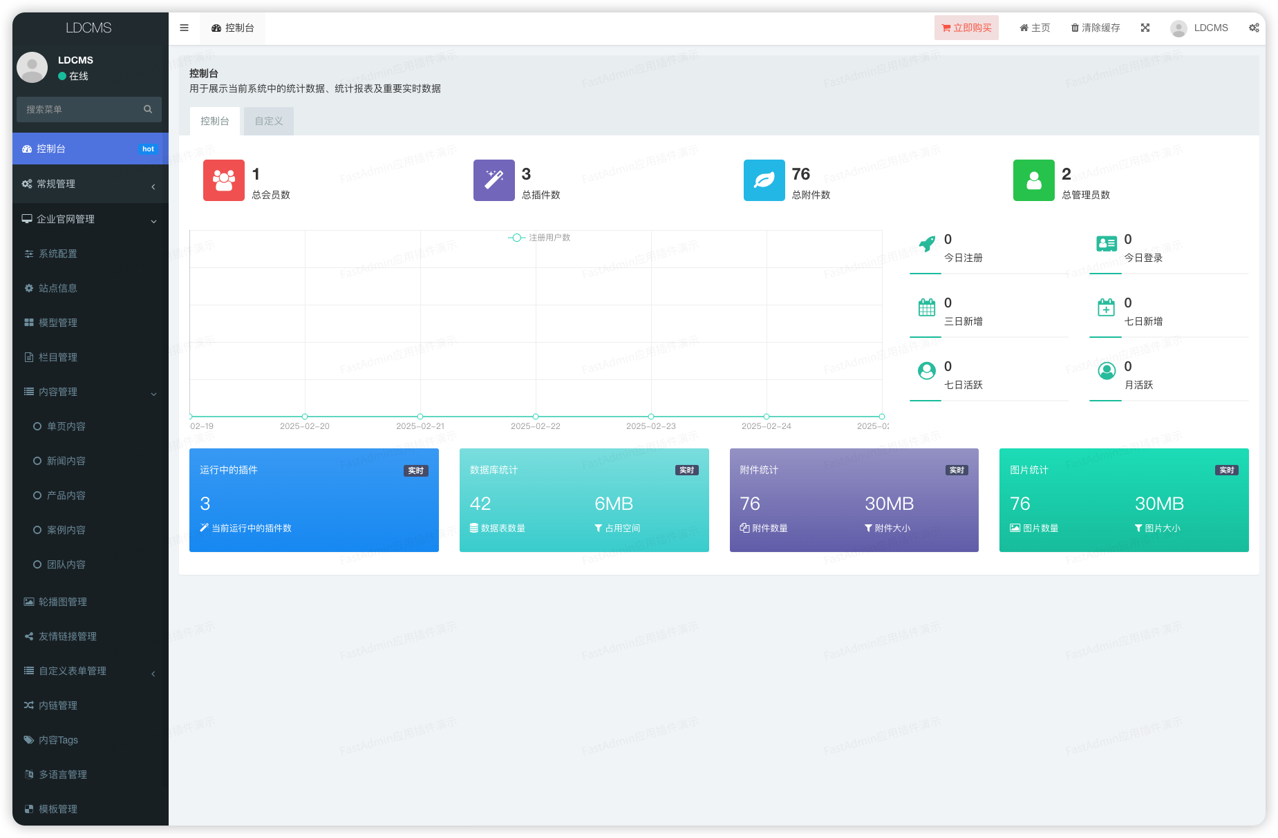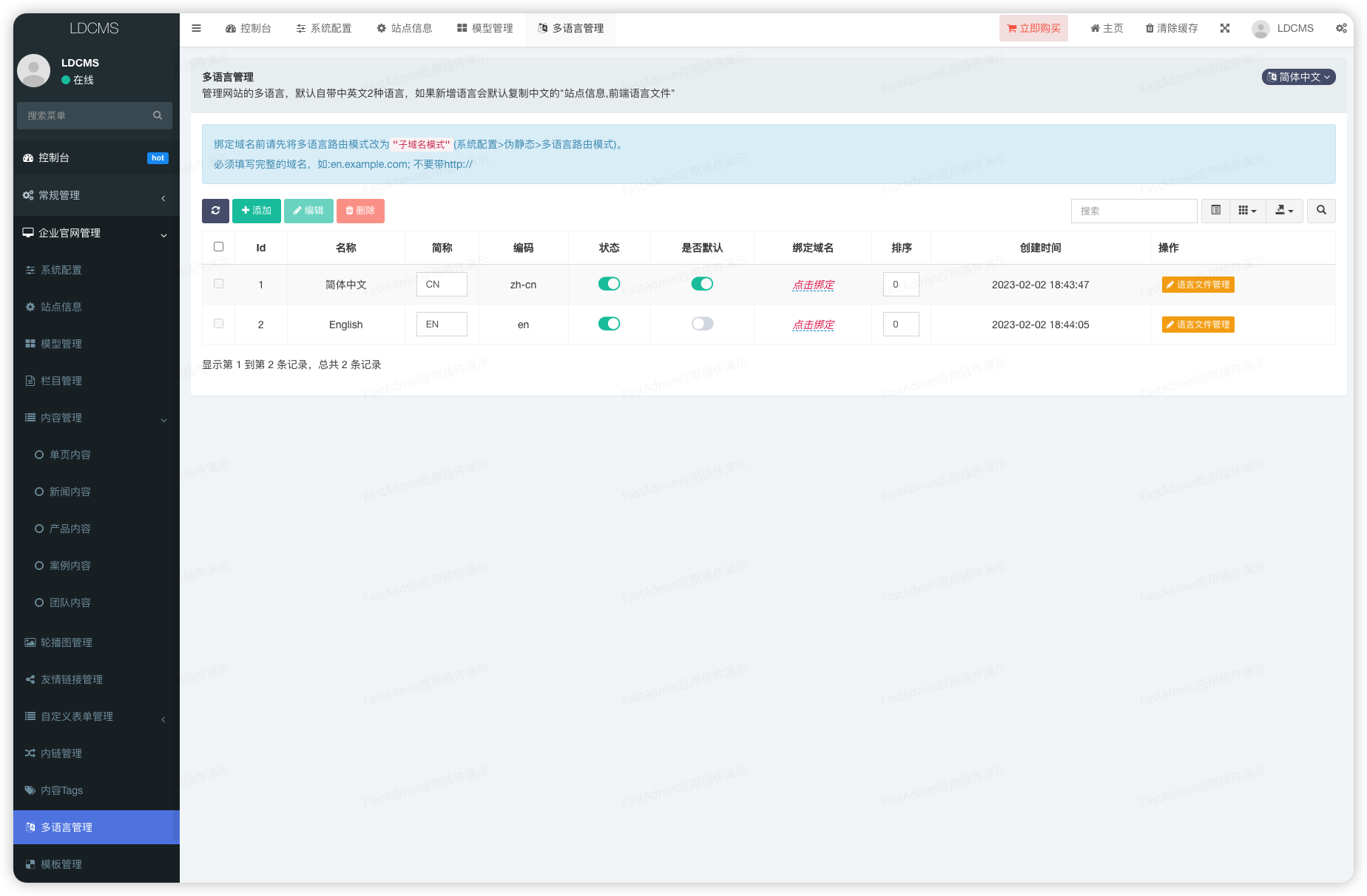 產品功能● 多語言功能(預設中英文,後臺可新增語言,並支援管理前臺語言包);● 有道api翻譯功能;● 回應式佈局,手機、平板、PC自我調整匹配;● 模型管理(可自訂產品、新聞等模型與欄位);● 欄目管理,支援設置欄目許可權;● Banner圖:支援視頻上傳,PC端及手機端可分開設置;● 內容管理,支援設置頁面授權;● 支援內容定時發佈;● 自訂表單。